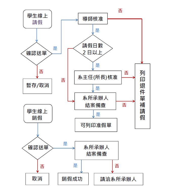 核假程序:請假2日以內由導師核准;請假連續3日(含)以上由系主任(所長)核准。